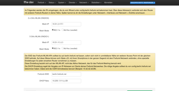 Je nachdem auf wievielen Frequenzen dein Router sendet, kannst du entweder eine oder zwei IP-Adressen zum Meshen konfigurieren. Über diese Adressen kann sich dein Router mit anderen Freifunk-Routern verbinden und erweitert so das Netz.