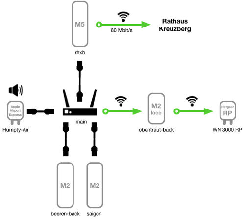 - NanoStation M5: Anbindung an Rathaus Kreuzberg mit >80Mbit/s up+down (iperf)