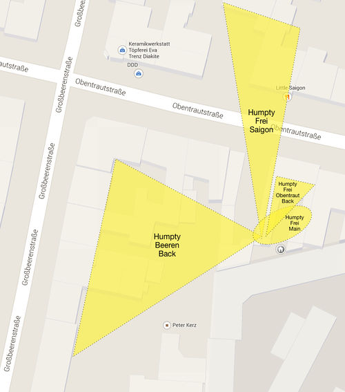 - Heute nochmal einen kleinen Trip gemacht in den großen Gewerbehof in der Großbeeren 71, die haben ein tiptop signal, wussten aber von nichts... Freifunk ist dort auf große Begeisterung gestossen. Könnte ein neuer Knoten werden, quatsche die Tage mit dem Verwalter des Hofes...