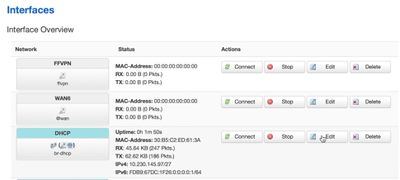 ACHTUNG! Beim beschriebenen Ablauf kann es dazu kommen, dass auf der ffuplink Firewall Zone weitergeleiteter Traffic zurückgewiesen wird. Dies führt zu Problemen. Weitergeleiteter Traffic der ffuplink Zone muss zugelassen werden! Das Problem tritt nicht auf, wenn man die Zuweisung zur Firewall-Zone aus den Schnittstellen-Settings vornimmt.