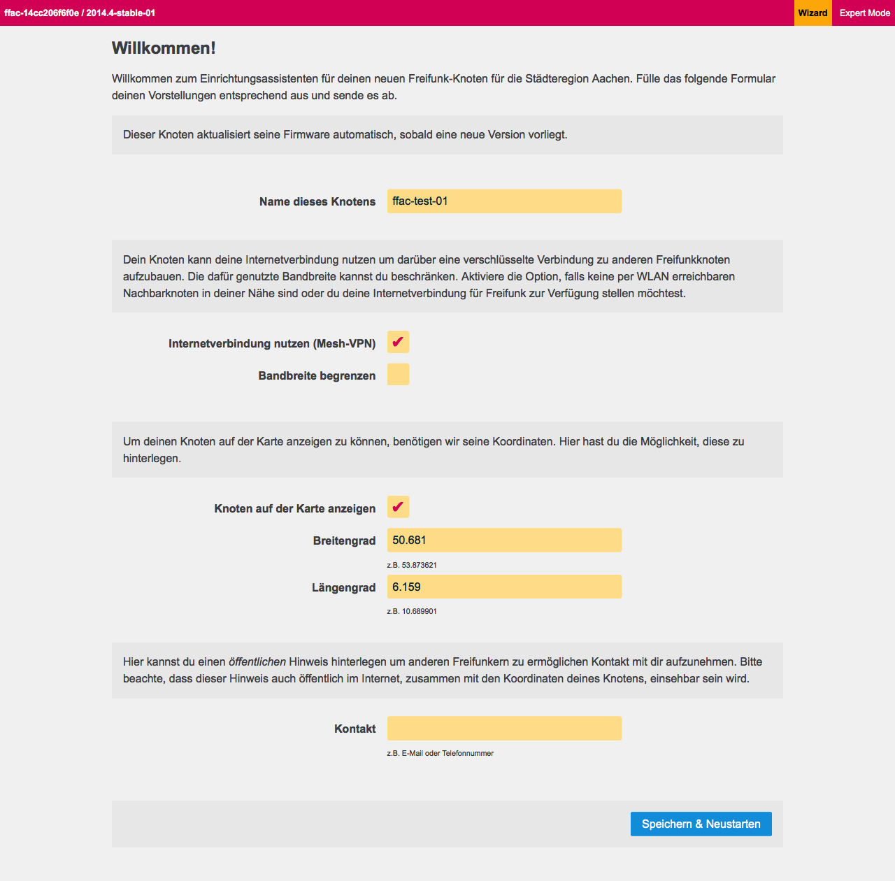 Screenshot des Gluon-Einrichtungswizards, Aachener Firmware.