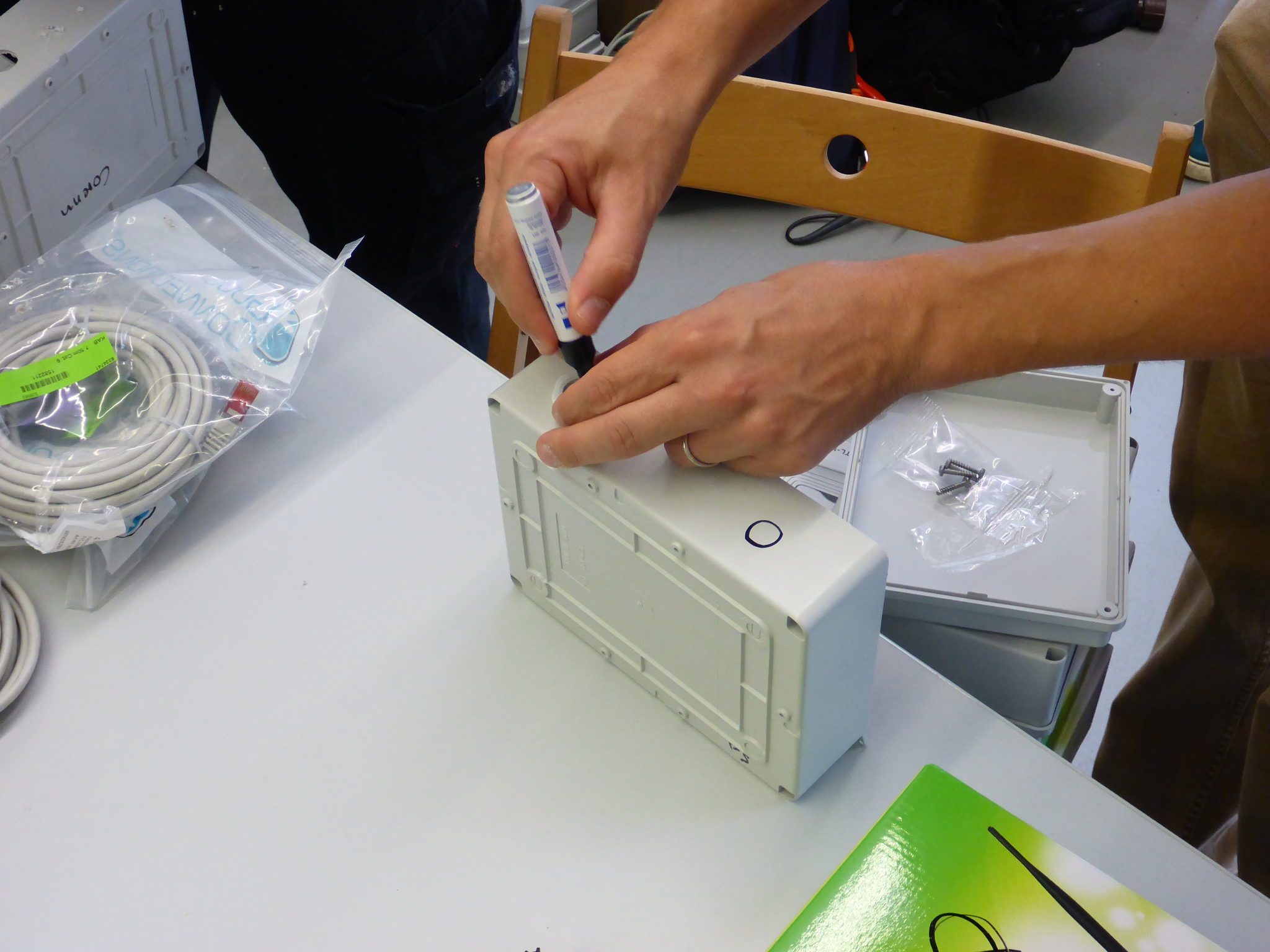Löcher am Gehäuse des Outdoorrouters anzeichen um später gut zu bohren.