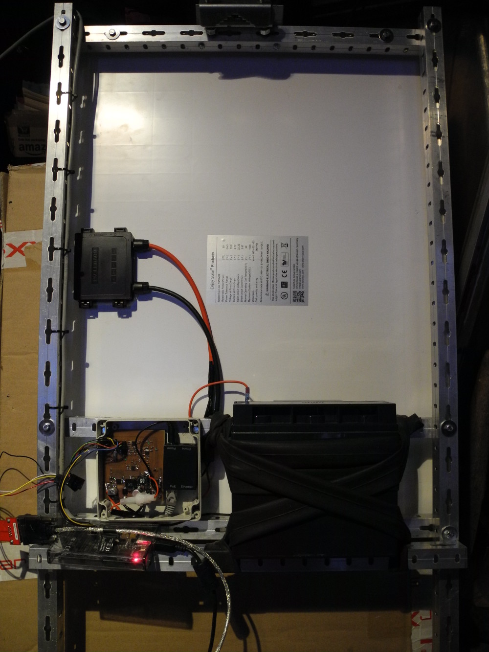 Stromversorgungsmodul, von der Rückseite des Solarmoduls aus gesehen. Links unten die Box mit PoE Adapter und dem Freifunk-MPPT-Solarladeregler. An die Datenschnittstelle des MPP-Tracker ist ein Programmieradapter angeschlossen (AVR Dragon). Rechts der Akku 12 V / 18 Ah. Das Stromversorgungsmodul ist komplett verdrahtet, vormontiert. Sobald die Sicherung zum Akku eingelegt wird, ist das Stromversorgungsmodul betriebsbereit.