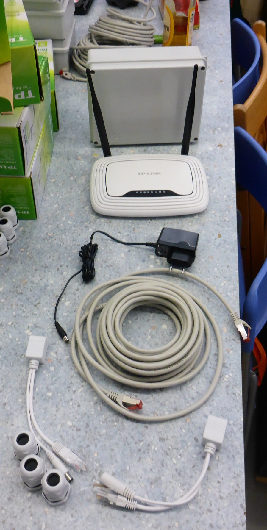 Für den Umbau eines TP 841N in einen outdoorfähigen POE Router benötigte Teile. Von hinten nach vorne: - Gehäuse - Router - Netzteil (beim Router enthalten) - LAN-Kabel (kurz beim Router enthalten, Flachband geht auch bis zu einer gewissen Länge für POE - POE Adapter - Kabelverschraubungen