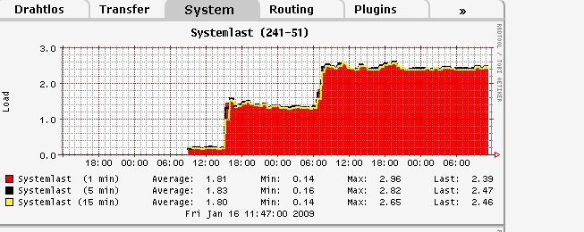 Load average: 3.16, 2.70, 2.52 (State: S=sleeping R=running, W=waiting) PID USER STATUS RSS PPID %CPU %MEM COMMAND 13491 root R 384 13412 44.3 1.2 S60dnsmasq 4106 root R 384 4105 44.3 1.2 cron.minutely