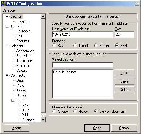 Zuerst laden wir uns das Programm [[1]] runter. Wenn der Download beendet ist, einfach die Putty.exe ausführen und dann sollte man folgendes Fenster sehen: