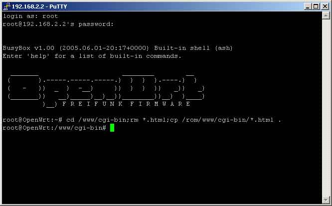 Das ist Euer WRT! (hoffentlich ;) ) Dort loggt ihr Euch als root ein und tippt das Passwort passend zu Euren WRT ein. Dann sollte sich die Busy-Box melden.