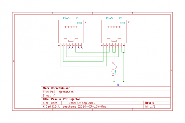 Im Artikel wird erklärt, wie man einen vereinfachten Power over Ethernet Injector für 100MBit Geräte selber bauen kann. Die Idee ist, von einem achtadrigen Ethernetkabel die für 100MBit Ethernet notwendigen Datenleitungen unangetastet zu lassen und die dafür ungenutzten Leitungen für die Stromversorgung zu verwenden, wie im Standard vorgesehen (mehr dazu s.u.). Damit kann man