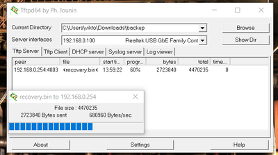 Unter Windows kann das Programm Tftpd64 by Ph. Jounin genutzt werden, um die .bin-Datei bereit zu stellen.